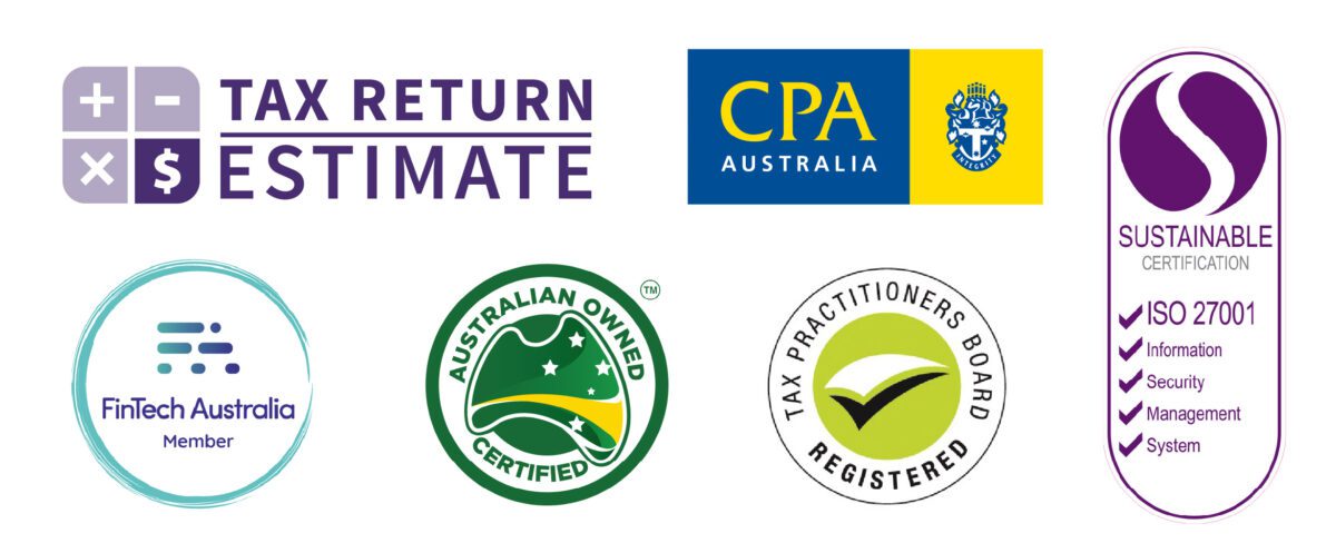 One Click Life Trusted Partners logos: Tax Return Estimate, CPA, FinTech Australia, Australian Owned Certified, Tax Practitioners Board Registered